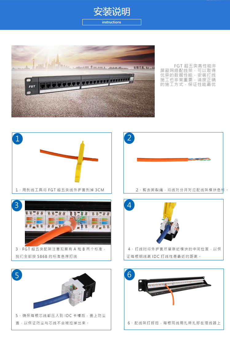 CAT .5e UTP patch panel Implementation standards: YD/T 926.3, ISO/IEC 11801, ANSI/TIA-568.2-D. Support voice communication system, 10BASE-T, 16Mbps, 100BASE-T, 155Mbps and 622 Mbps ATM, 1000 Mbps, multimedia and other high-speed applications.